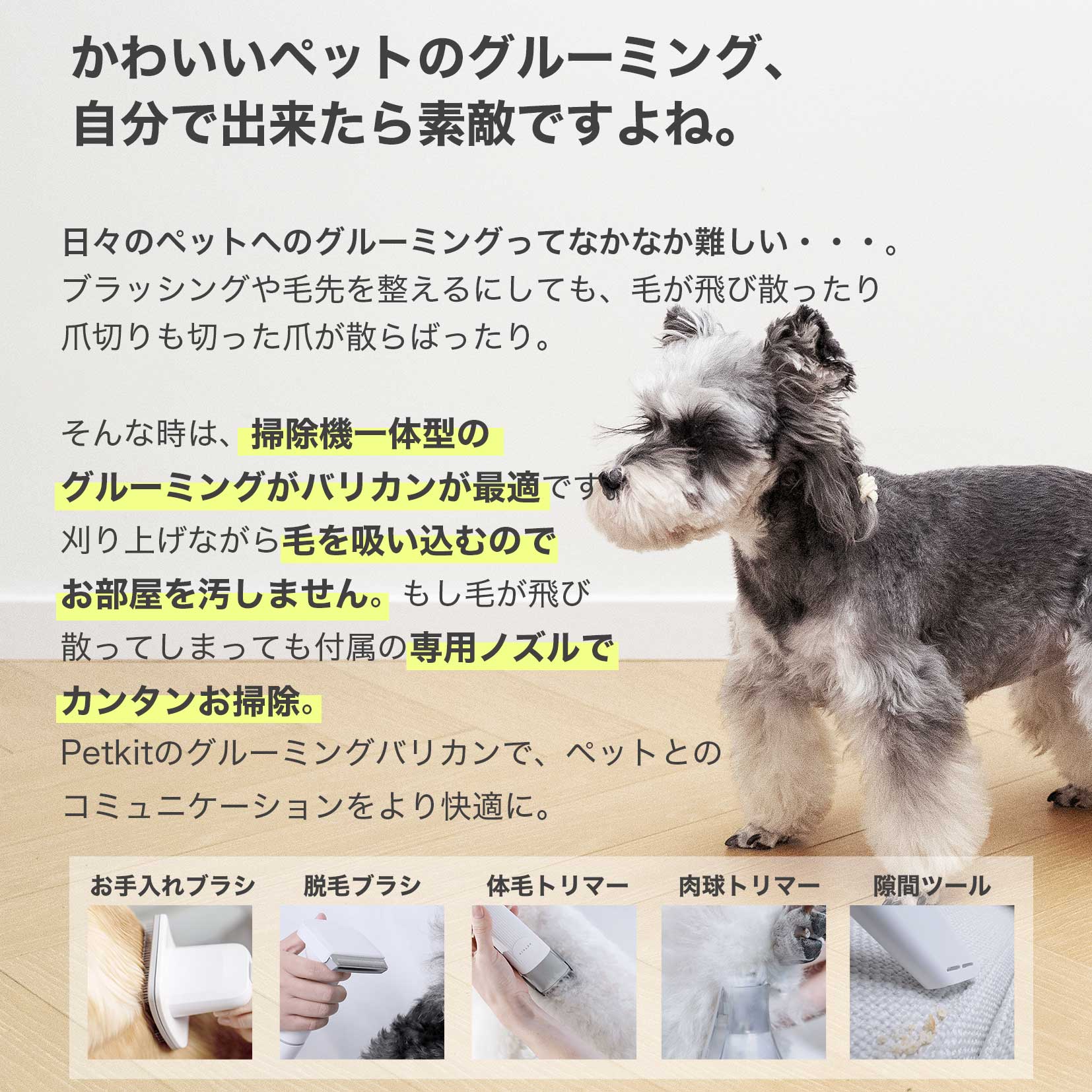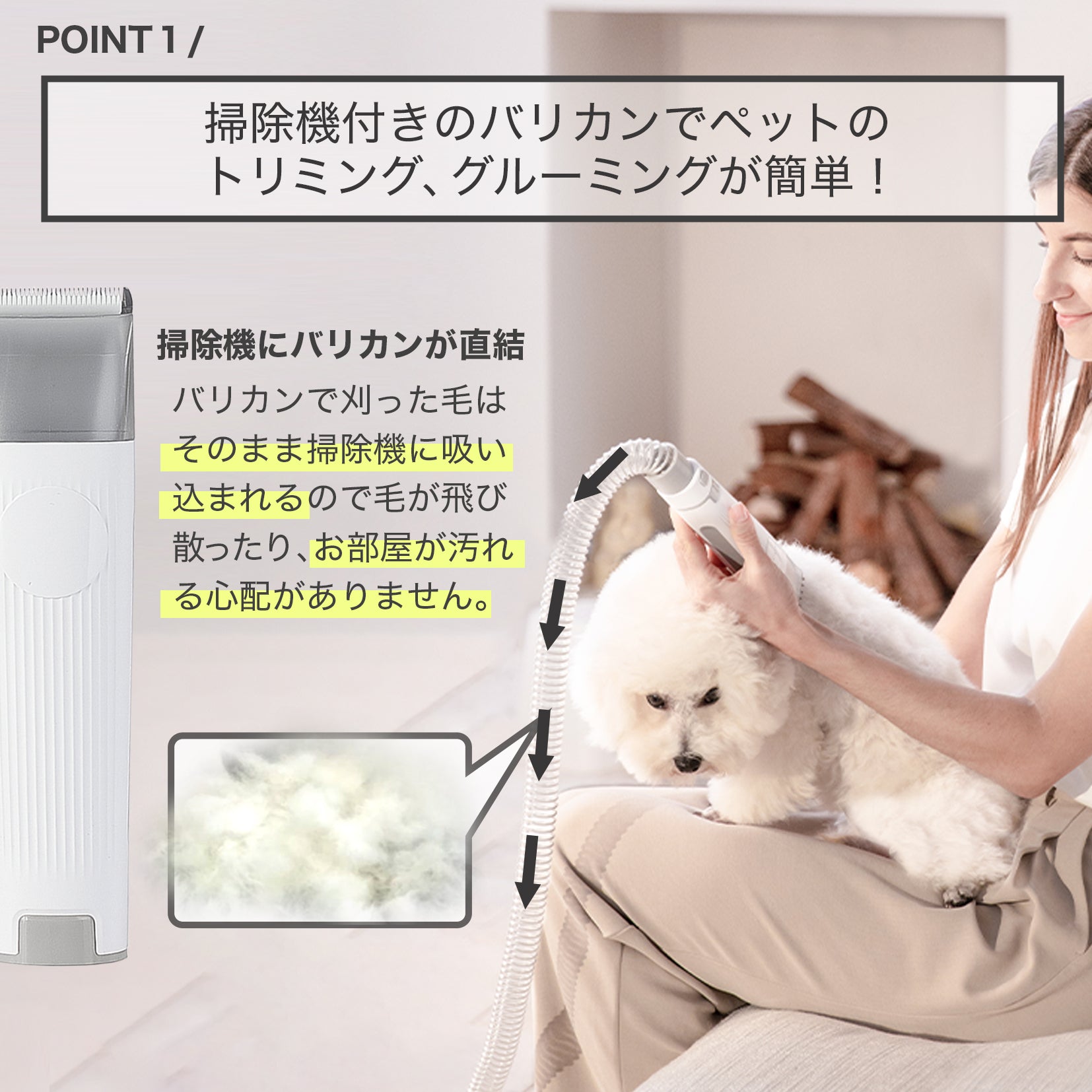掃除機にバリカンやブラシが真っすぐするので、バリカンで刈った毛やブラッシングで抜けた毛をそのまま掃除機が吸い込み、毛が飛び散るのを防ぎます。お部屋が汚れないのでグルーミング後のお掃除も楽です。