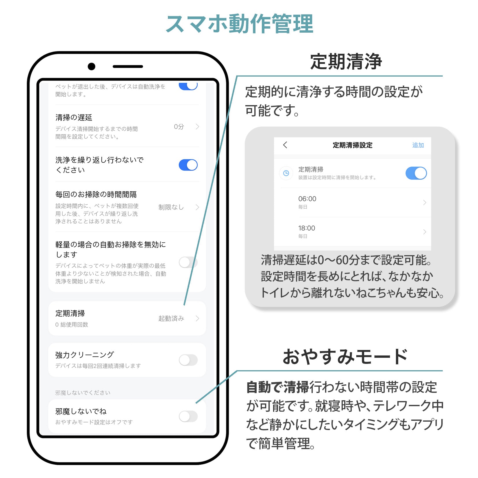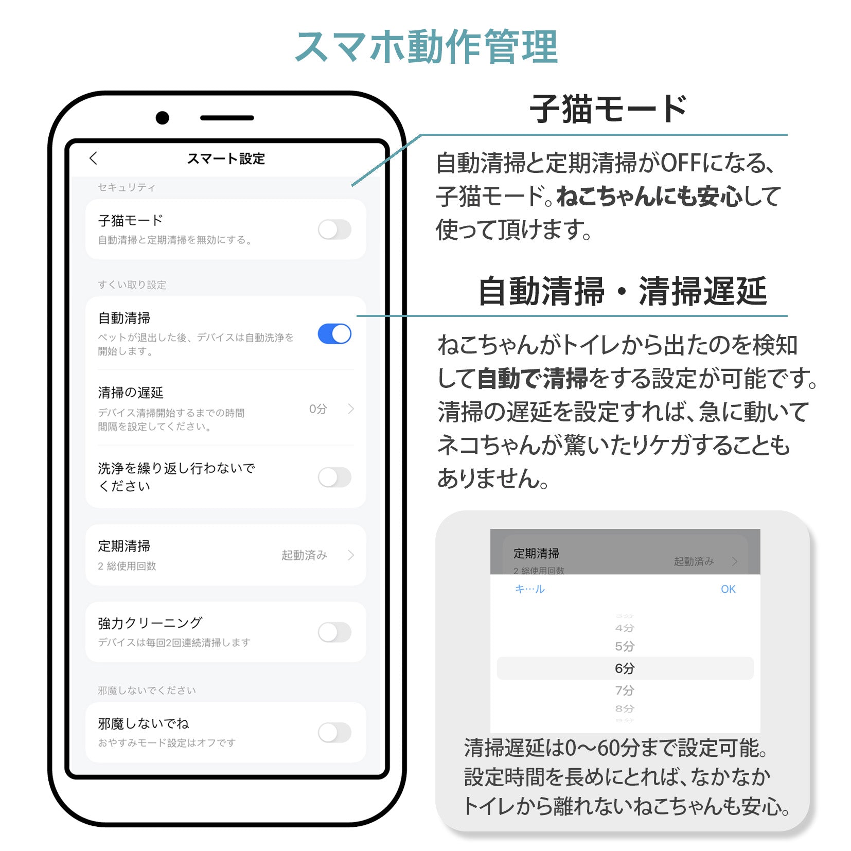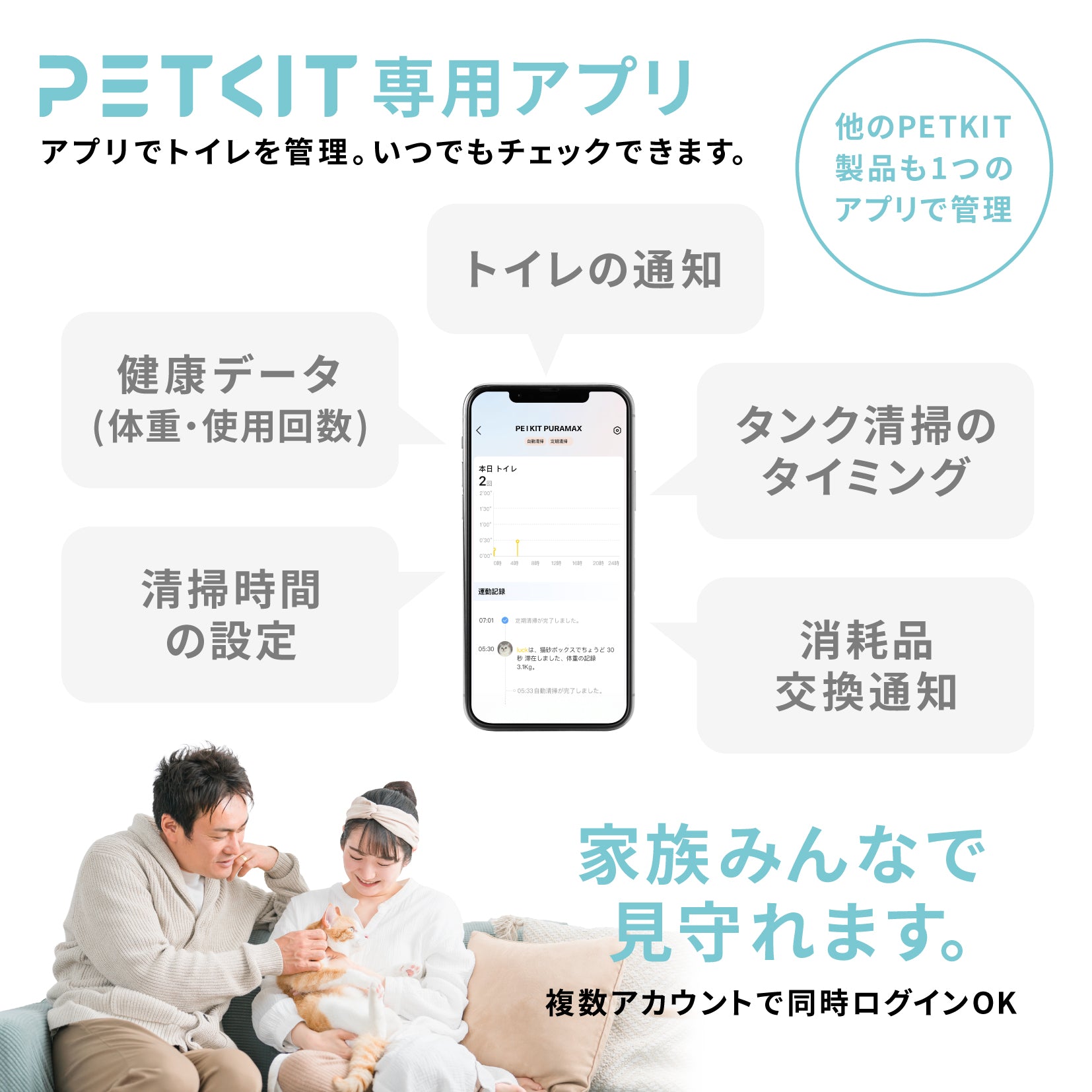 ・取り扱い説明書/自動モード ・稼働状況 ・健康管理 ・トイレの使用状況の追跡 ・洗浄回数/タイミングの調整 ・複数の猫のデータを分析。