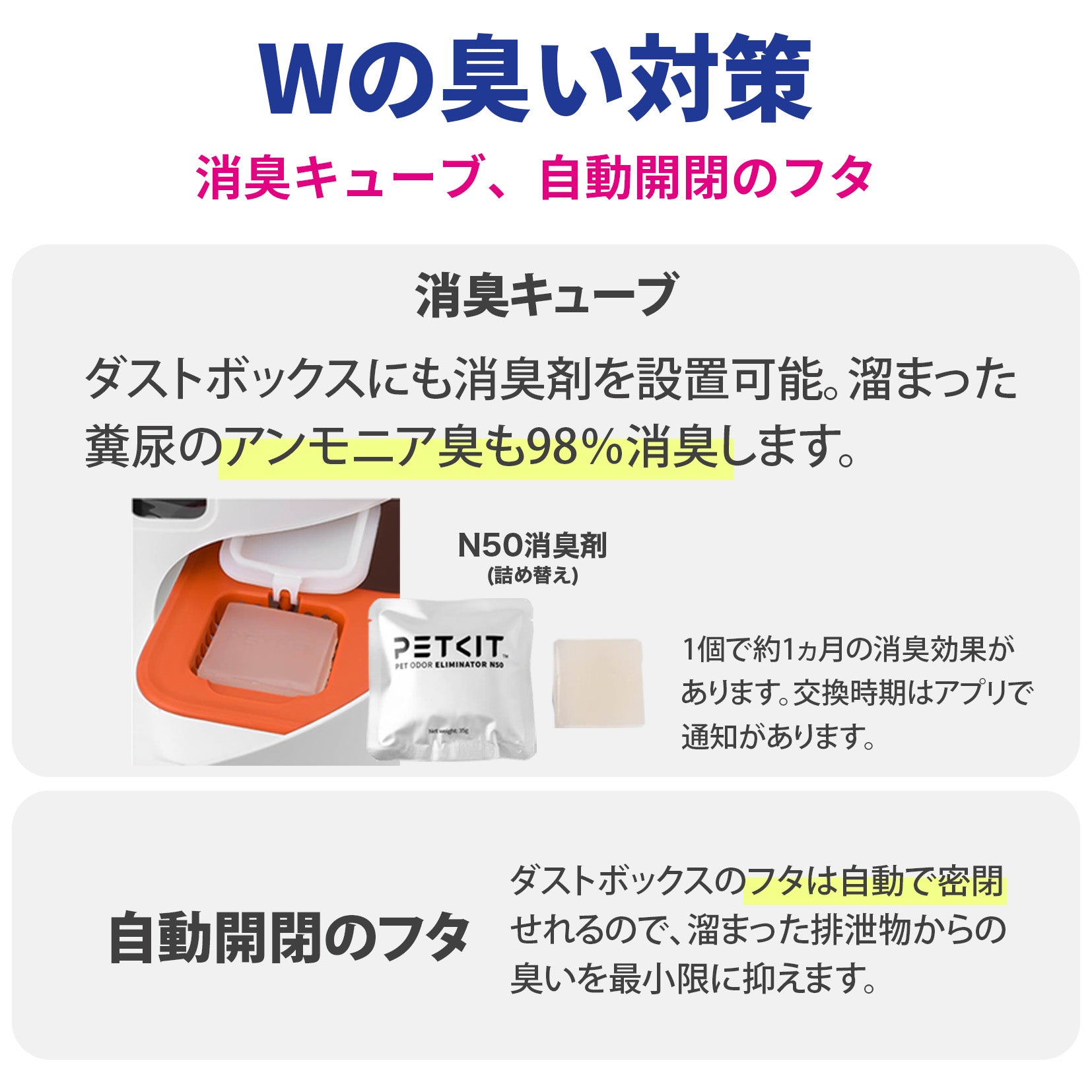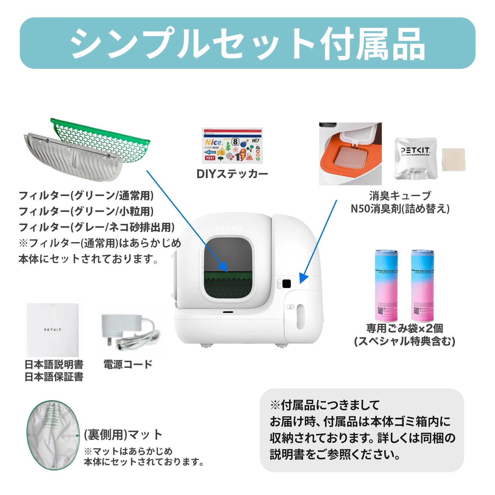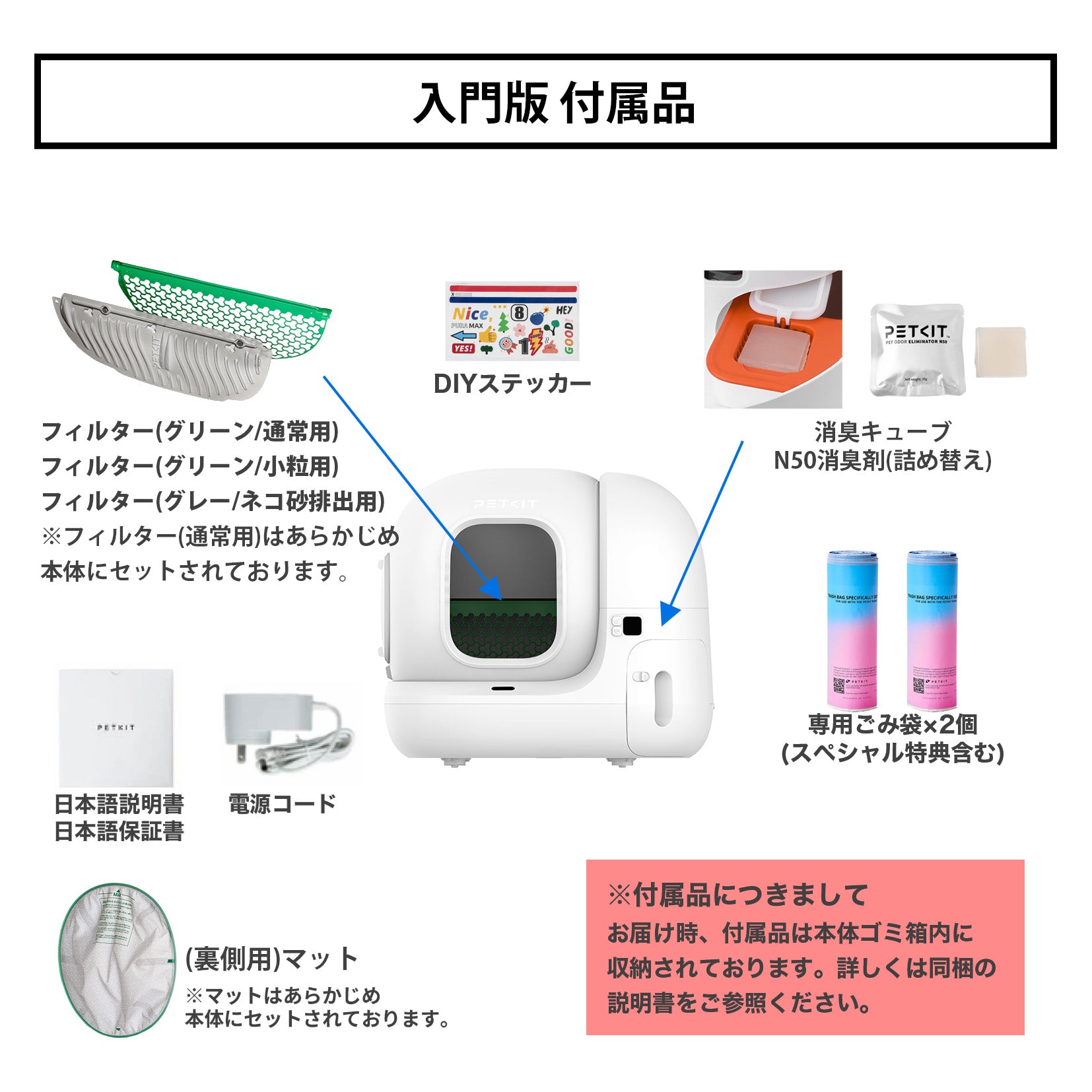 | パッケージリスト | 本体、フィルター(グリーン)、フィルター(グレー)、消臭スプレー、マット(裏側用)、マット(入り口用)、N50消臭剤、専用ゴミ袋×2(特典含む)、取り扱い説明書、電源コード、DIYステッカー |