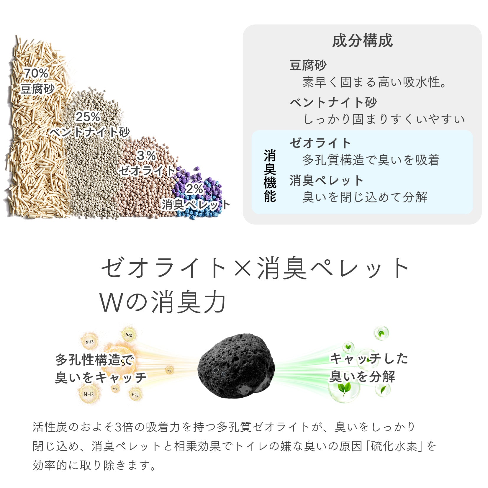 | 原材料 | 豆腐砂 70% ベントナイト砂 25% ゼオライト 3% 消臭ペレット 2% |